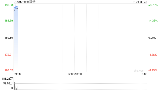 泡泡玛特(09992)早盘高开,截至发稿,股价上涨7.85%,现报195港元,成交额9.516亿港元。