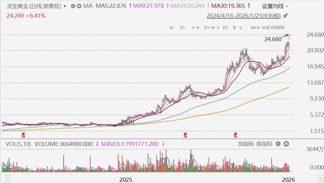 国际金银价格不断创出历史新高,港股市场相关概念股集体走强,其中,灵宝黄金(330.HK)一度大涨超8%至24.66港元,创历史新高价,市值超310亿港元。