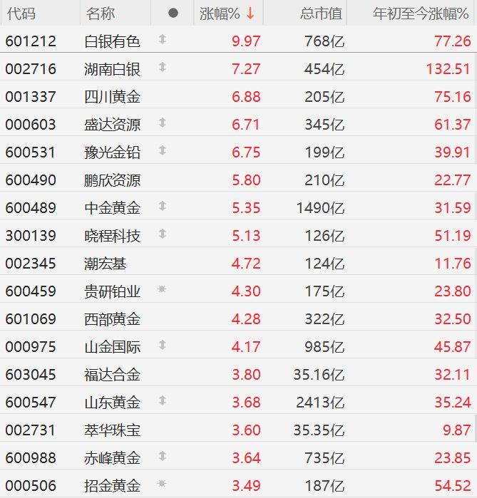 A股市场黄金概念股走强,其中,白银有色触及涨停,湖南白银涨超7%,四川黄金、盛达资源、豫光金铅涨超6%,鹏欣资源、中金黄金、晓程科技涨超5%。
