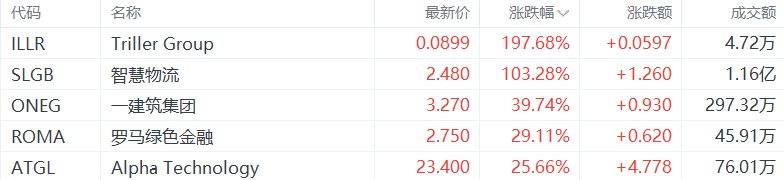 中概股收盘涨幅居前的个股为:Triller Group涨197.68%,智慧物流涨103.28%,一建筑集团涨39.74%,罗马绿色金融涨29.11%,Alpha Technology涨25.66%。XM官方网址(格隆汇)