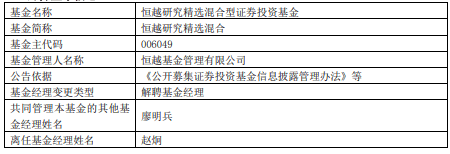 中国经济网北京11月27日讯 今日,恒越基金管理有限公司公告,赵炯离任恒越智选科技混合、恒越研究精选混合。