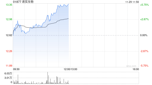 君实生物(01877)早盘持续上扬,股价现涨5.39%,报13.30港元,成交额1216.25万港元。