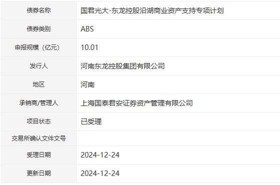 【大河财立方消息】12月25日消息,国君光大-东龙控股沿湖商业资产支持专项计划项目获深交所受理。债券申报规模10.01亿元,发行人为河南东龙控股集团有限公司,承销商/管理人为国泰君安资产管理。2024年7月22日,经联合资信综合评定,发行人主体信用评级为AA+,展望稳定。