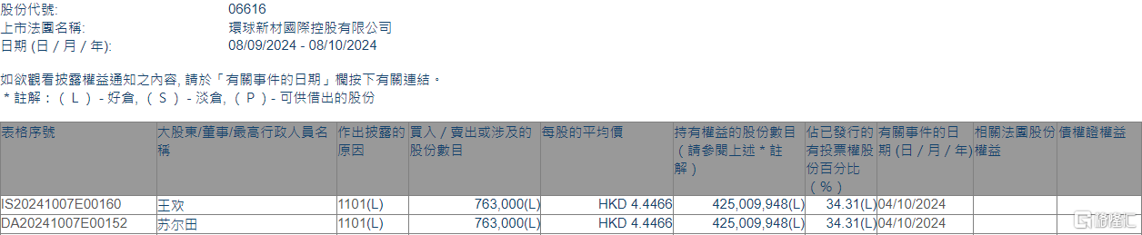 格隆汇10月8日丨根据联交所最新权益披露资料显示,2024年10月4日,环球新材国际(06616.HK)获执行董事、主席兼行政总裁苏尔田在场内以每股均价4.4466港元增持76.3万股,涉资约339.XM官方网址28万港元。