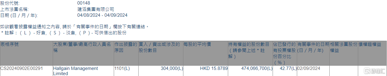 格隆汇9月4日丨根据联交所最新权益披露资料显示,2024年9月2日,建滔集团(00148.HK)获Hallgain Management Limited在场内以每股均价15.8789港元增持30.4万XM官方网址股,涉资约482.72万港元。